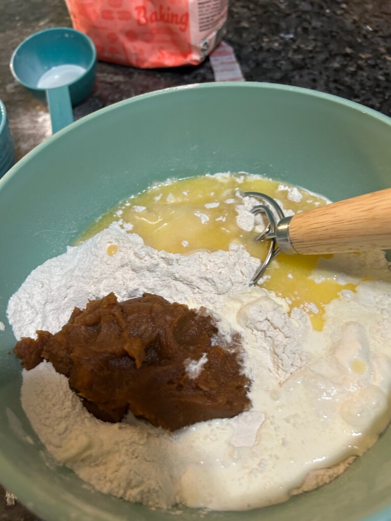 - Mix wet ingredients: In a large bowl, stir together pumpkin puree, melted butter, and cream until smooth.