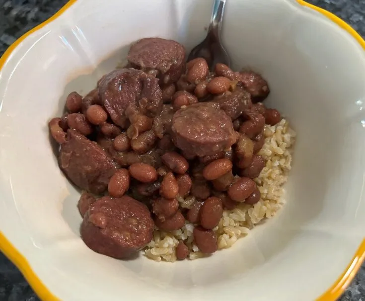 NOTE: This recipe uses quick-soaked red beans. I brought a pan of water to a boil, put the beans in it, then turned the water off and covered the pan. I let the beans soak for an hour, then rinsed and sorted them for use. If your beans are unsoaked, increase cook time to 50 minutes + 20-min natural release.
